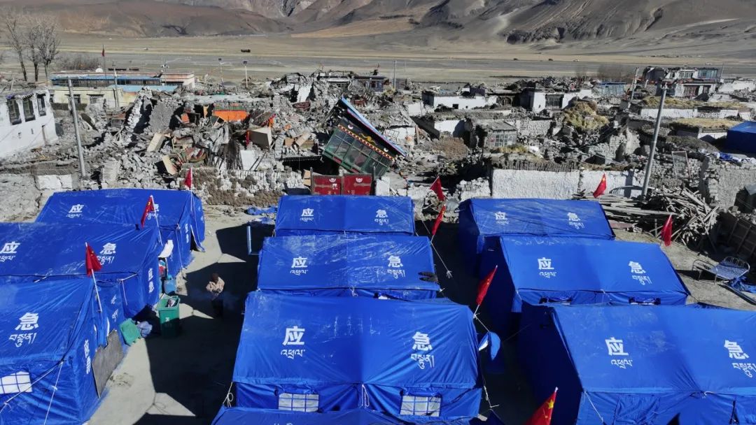 圖為在日喀則市定日縣長所鄉(xiāng)嘎布村安置點,日喀則邊境管理支隊嘎布村“帳篷警務室”民警幫助群眾卸載救災物資。貢嘎齊平 攝