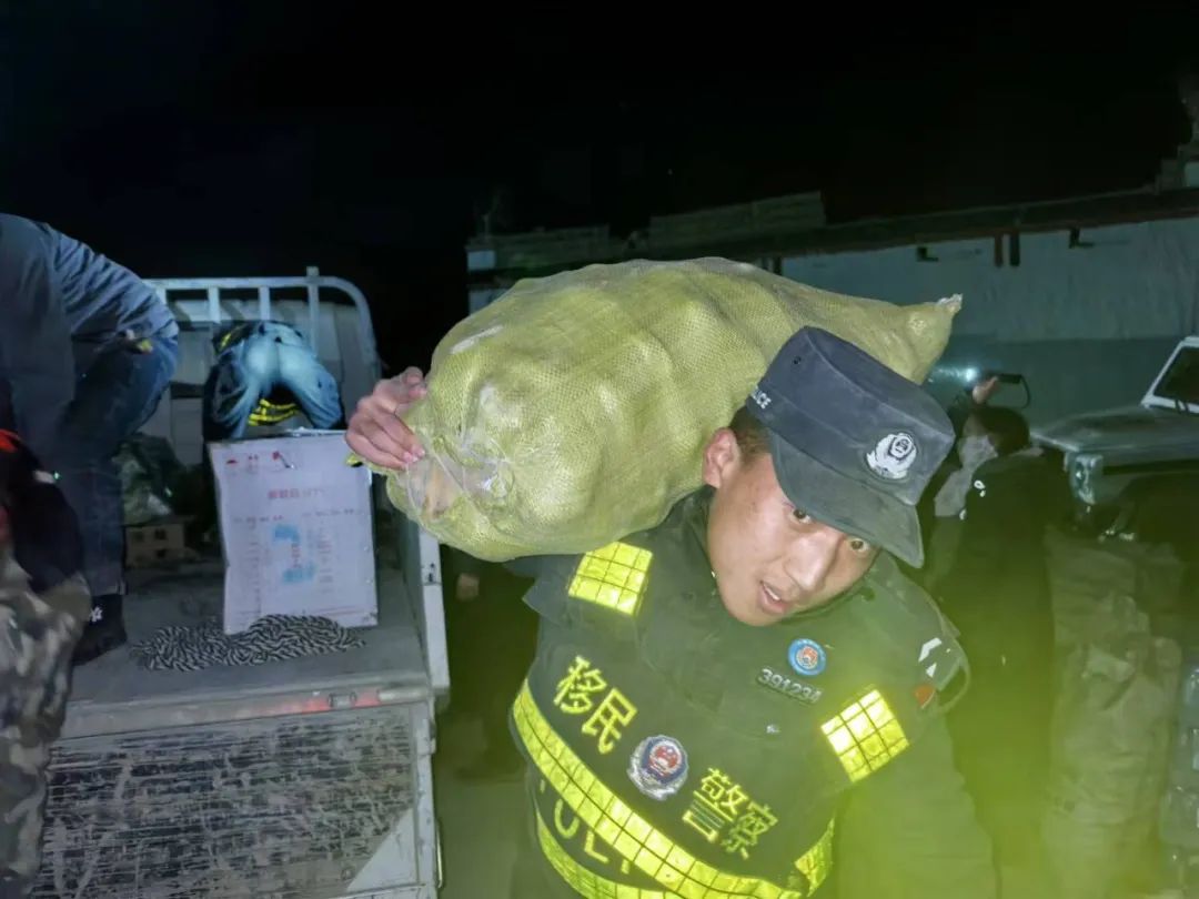 圖為在日喀則市定日縣長所鄉(xiāng)雜村安置點,日喀則邊境管理支隊雜村“帳篷警務室”民警搬運物資。蘇恒 攝