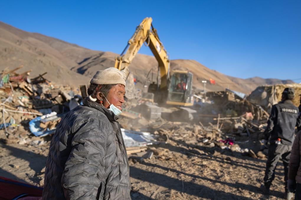 1月13日,在定日縣長(zhǎng)所鄉(xiāng)古榮村,次仁扎西老人站在自家的廢墟前。新華社記者丁增尼達(dá) 攝