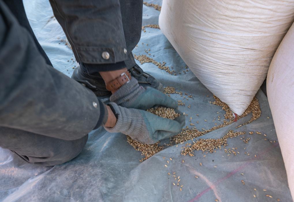 1月13日,在定日縣長(zhǎng)所鄉(xiāng)古榮村,公安干警用手捧起灑在地上的青稞。新華社記者丁增尼達(dá) 攝