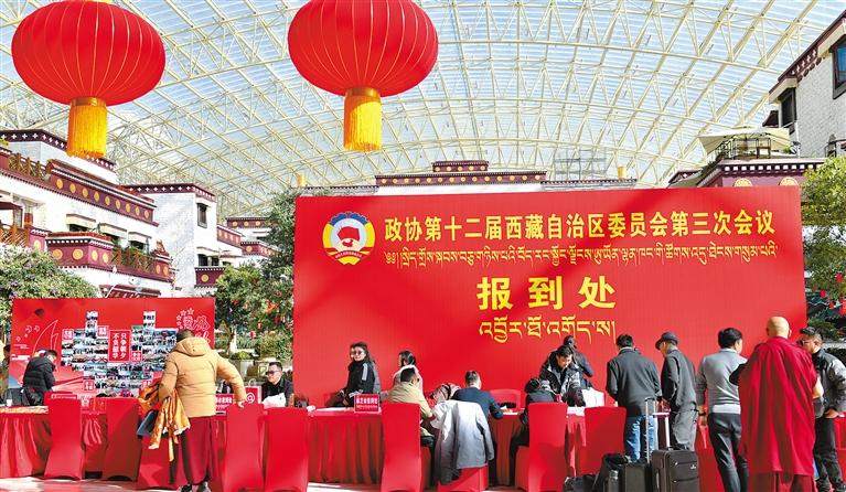 在拉薩圣地天堂洲際大飯店,自治區(qū)政協(xié)委員報到工作有條不紊進行。政協(xié)委員們精神飽滿、激情滿懷地討論各自帶來的提案。