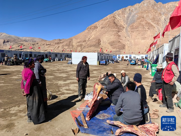 在定日縣曲洛鄉(xiāng)熱木青村安置點(diǎn),村民們正在分發(fā)牛羊肉(1月14日攝)。新華社記者 林建楊 攝