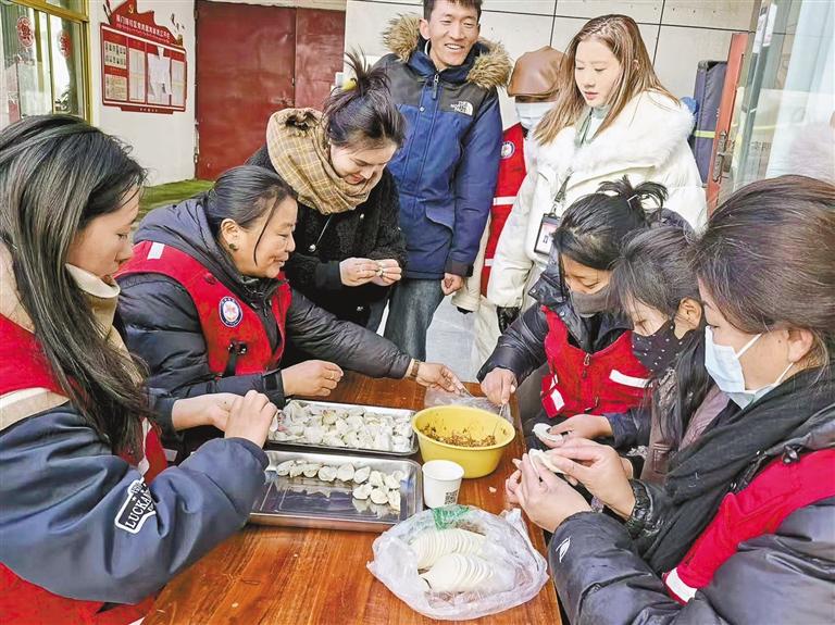 上圖:1月27日,拉薩市城關(guān)區(qū)策門林社區(qū)工作人員與居民一起包餃子。