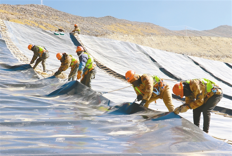 中鐵十七局集團第二工程有限公司西藏巨龍德慶普項目現(xiàn)場工人正在拉薩市達孜區(qū)海拔5000米以上的施工區(qū)域進行鋪膜防滲作業(yè)。
