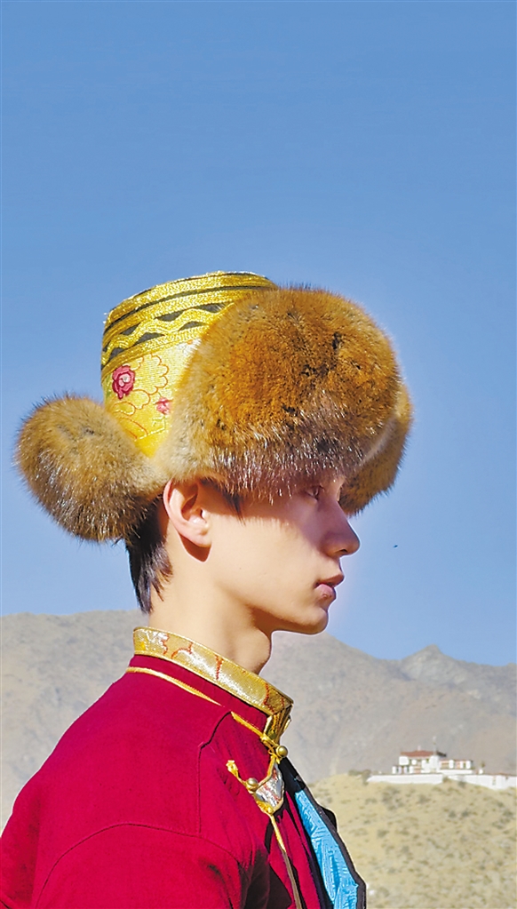 “朗霞”藏語意為氆氌帽,是墨竹工卡縣女性服飾的重要組成部分。這種帽子以黑色氆氌做底,兩側(cè)鑲有花邊,后面翹有兩個角,實(shí)用又美觀,成為女性展示自身魅力的重要配飾。帽子的裝飾因年齡和身份的不同而有所差異,年輕女孩戴的帽子裝飾較多,花紋圖案豐富,頂上為八瓣花,代表著吉祥八寶(傳統(tǒng)圖案)的數(shù)量;成年女性的帽子則少些花俏,更為沉穩(wěn);老年婦人的帽子則簡潔大方,透露出歲月的積淀與智慧;而僧尼的帽子則為絳紅色,彰顯著她們的宗教身份與信仰。