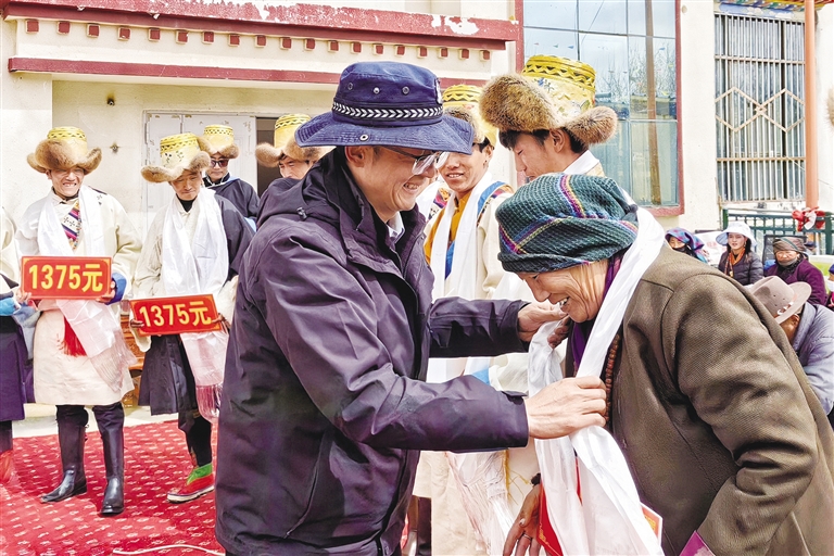 “羅薩扎西德勒!這是您家的分紅款!”定結(jié)鄉(xiāng)黨委副書記、鄉(xiāng)長高文雄為75歲的村民央金遞上分紅紅包并表達(dá)自己的祝福。長桌上,“卡賽”、青稞酒擺成“豐收塔”;長桌旁,8.8萬元分紅款化作“新年紅包”,村民們揣著紅包看表演,共同分享村集體經(jīng)濟(jì)發(fā)展的豐碩成果,藏歷新年的喜慶與鄉(xiāng)村振興的碩果在此刻交融。