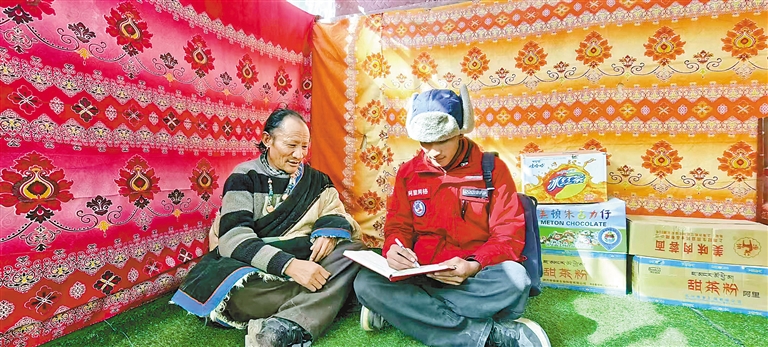 圖為改則縣先遣鄉(xiāng)那日村網格員扎西曲桑(右)入戶采集村民信息。 (圖片由阿里地委政法委提供)