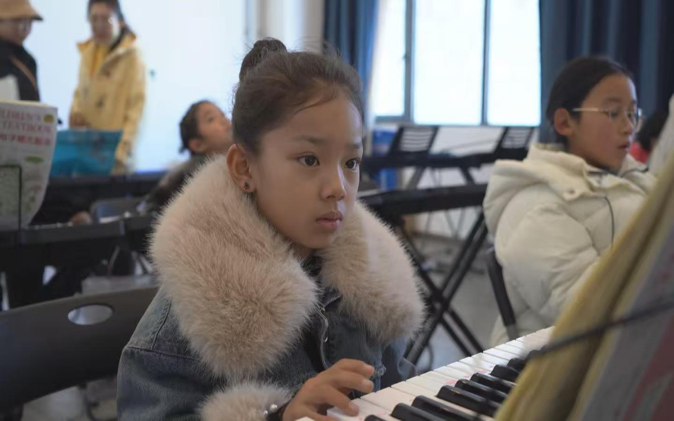 15日,一名孩童在西藏青少年興趣培訓(xùn)班學(xué)習(xí)彈奏鋼琴。(西藏青少年實(shí)踐教育基地供圖)