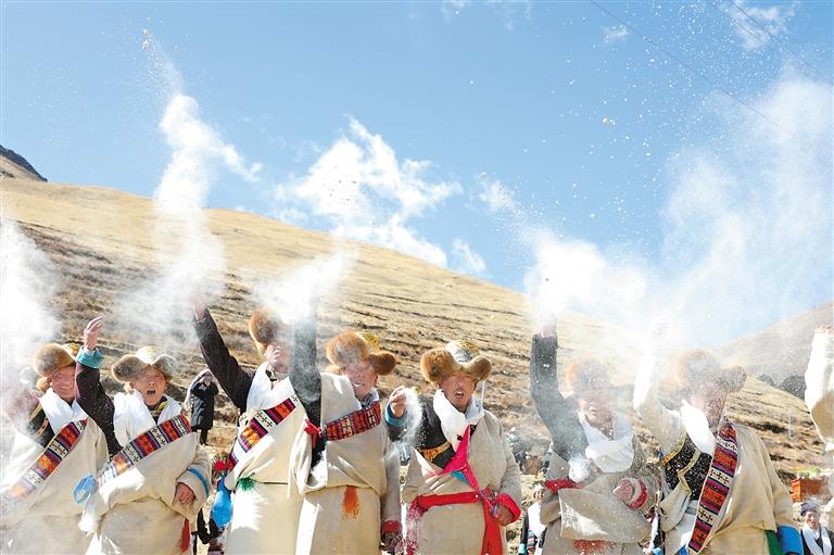 山南市瓊結縣拉玉鄉(xiāng)村民拋撒糌粑。通訊員 米瑪央金 倫珠澤仁 攝