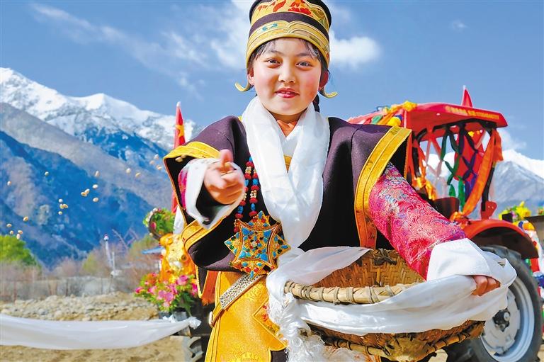 林芝市工布江達縣工布江達鎮(zhèn)阿沛村春耕春播儀式上,被推選為“播種者”的次旦拉姆身著盛裝,撒下青稞種子。記者 謝筱純 攝