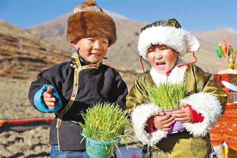 山南市瓊結縣拉玉鄉(xiāng)的小朋友們手捧青稞苗。通訊員 米瑪央金 倫珠澤仁 攝