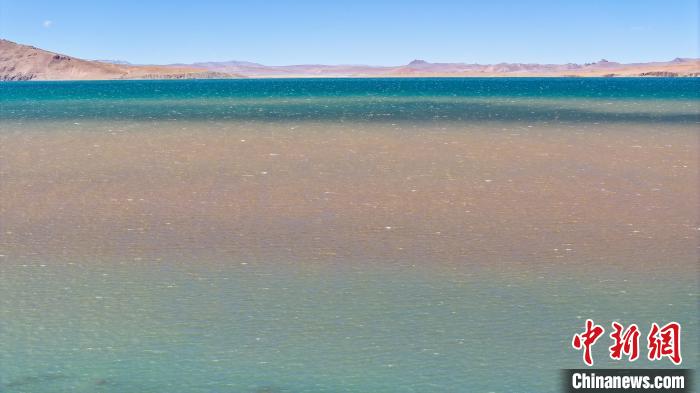 3月27日,航拍西藏自治區(qū)那曲市安多縣錯那湖,湖水交匯處好似“鴛鴦火鍋”。錯那湖是怒江的源頭湖,海拔4600米左右,是世界上海拔最高的淡水湖,也是青藏鐵路沿線著名景點之一。(無人機照片)中新社記者 馬銘言 攝