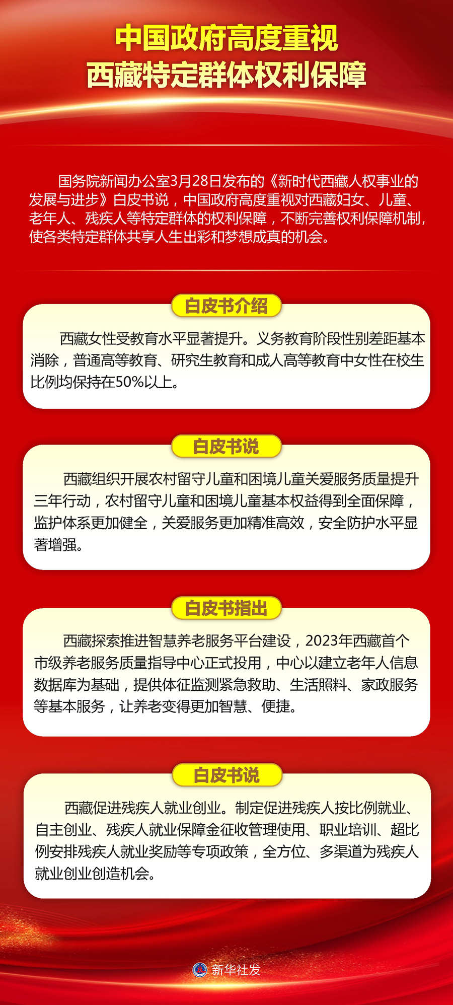 國(guó)務(wù)院新聞辦公室28日發(fā)布的《新時(shí)代西藏人權(quán)事業(yè)的發(fā)展與進(jìn)步》白皮書(shū)說(shuō),中國(guó)政府高度重視對(duì)西藏婦女、兒童、老年人、殘疾人等特定群體的權(quán)利保障,不斷完善權(quán)利保障機(jī)制,使各類特定群體共享人生出彩和夢(mèng)想成真的機(jī)會(huì)。