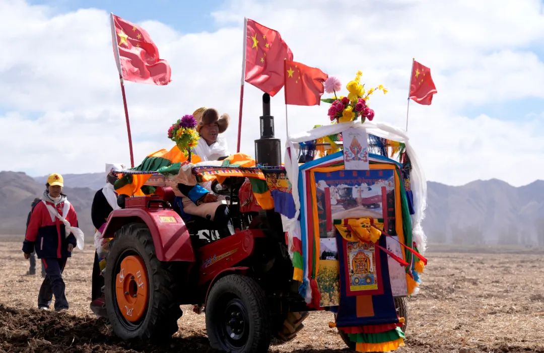 2025年3月16日,西藏拉薩強(qiáng)嘎鄉(xiāng)春耕儀式現(xiàn)場。拖拉機(jī)被盛裝打扮,祈求風(fēng)調(diào)雨順、農(nóng)業(yè)豐收。中新社記者 李林 攝