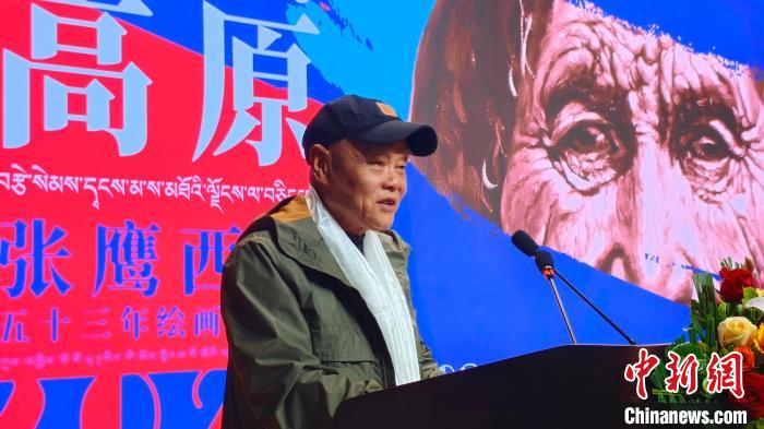 圖為張鷹在繪畫(huà)展開(kāi)幕式上講述他與西藏情緣。貢桑拉姆 攝