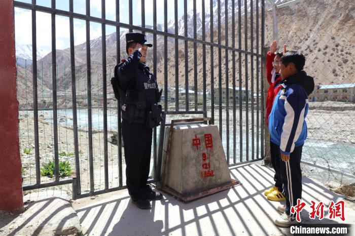 圖為普蘭邊檢站移民管理警察與駐地學(xué)校學(xué)生在界碑前相互敬禮。格熱 攝