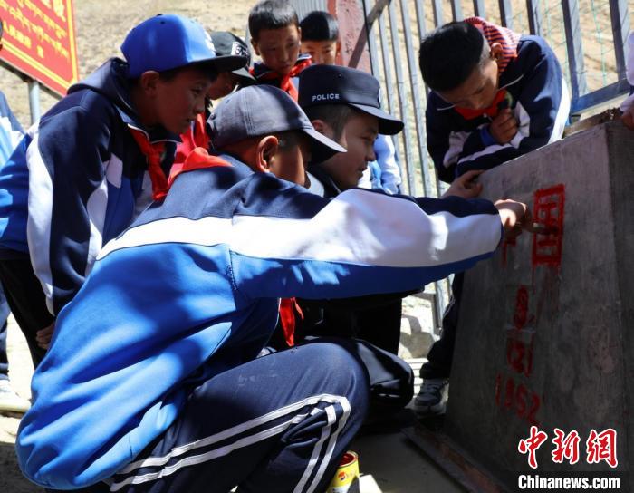 圖為普蘭邊檢站移民管理警察與駐地學(xué)校學(xué)生共同為界碑描紅。格熱 攝