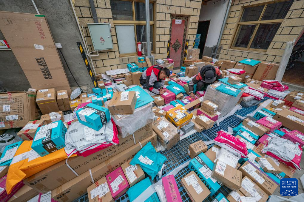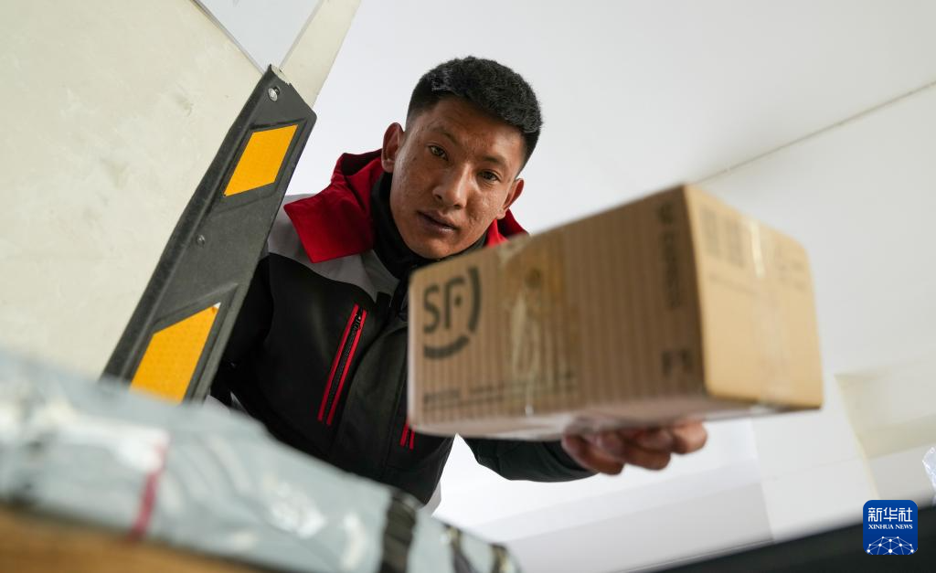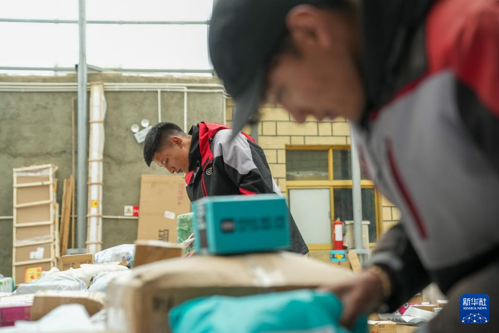 拉巴在站點(diǎn)內(nèi)整理快遞(4月24日攝)。新華社記者 晉美多吉 攝