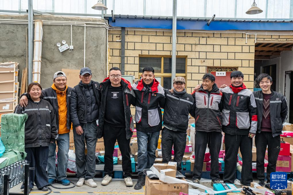 拉巴(左四)在站點(diǎn)內(nèi)打包快遞(4月24日攝)。新華社記者 晉美多吉 攝
