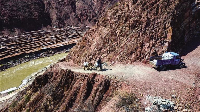 鹽田上,60歲的乃柯正和丈夫一起用木拍夯實(shí)鹽田。“現(xiàn)在用泵抽水輕松多了,但拍鹽田的手藝不能丟?!崩先说脑捳Z(yǔ)中,既有對(duì)科技的接納,也有對(duì)傳統(tǒng)的堅(jiān)守。鹽田下方,鹽晶垂落成簾,在山風(fēng)拂動(dòng)下閃爍微光,仿佛在訴說著千年文明的厚重。