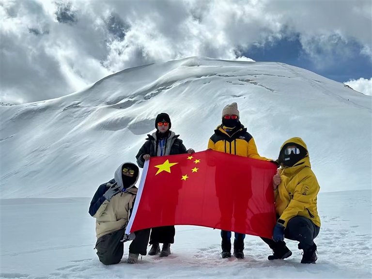 鄒師思告訴記者:“登山過程中,我們團(tuán)隊展現(xiàn)了高度的專業(yè)性與協(xié)作力。學(xué)院領(lǐng)導(dǎo)提前提供物資與精神支持,專業(yè)教練指導(dǎo)徒步與技術(shù)訓(xùn)練。在海拔5500—6000米段,隊伍統(tǒng)一行軍節(jié)奏,避免體溫流失或體力透支;登頂時,訓(xùn)練突出者率先觸頂,為體力較弱者提供鼓勵與幫助?!彼锌骸皥F(tuán)隊協(xié)作是登頂?shù)年P(guān)鍵,真正的勇氣源于科學(xué)準(zhǔn)備與戰(zhàn)略堅持?!?/p>