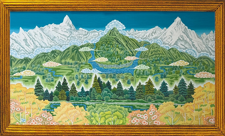 2020年,60歲的昂桑拜師一級美術師敬庭堯學習國畫,次年創(chuàng)作《雅魯藏布大峽谷》,雄渾地貌與水墨意境渾然天成。