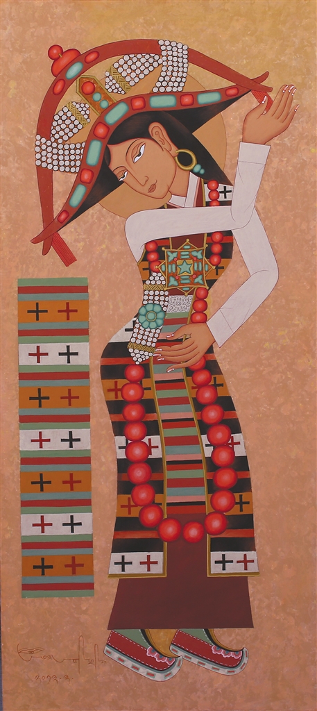 在昂?!皞鹘y(tǒng)當隨時代”的藝術理念浸潤下,徒弟們總能在傳統(tǒng)與當代的碰撞中找到獨特的表達坐標:來自日喀則的藝術家多吉次旺,早年被昂桑畫作中藏文元素與抽象色塊的融合所震撼。如今在拉薩創(chuàng)辦工作室的他,正將藏文書法的中鋒筆觸解構為流動的視覺符號——烏金體的頓挫韻律幻化為色彩的潮涌,在畫布上重現(xiàn)古老史詩的“當代心跳”;而主演《文成公主》實景劇的馮佳,這位四川傳媒大學表演系的畢業(yè)生,跟隨昂桑學畫四年,已能在《文成公主》系列中將唐卡礦物顏料的莊重與波普藝術的色塊切割并置,讓歷史人物既保有壁畫般的莊重感,又流淌著屬于時代的視覺節(jié)奏。