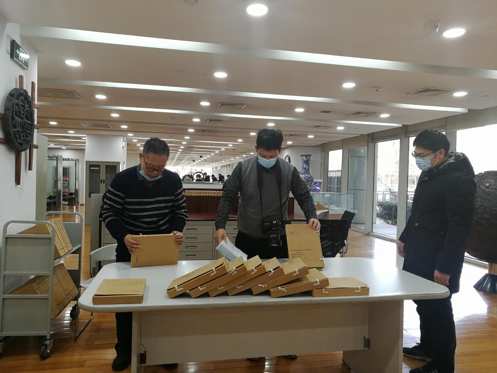 張文朋(中)在檔案館查閱建筑結(jié)構(gòu)圖紙。新華社發(fā)