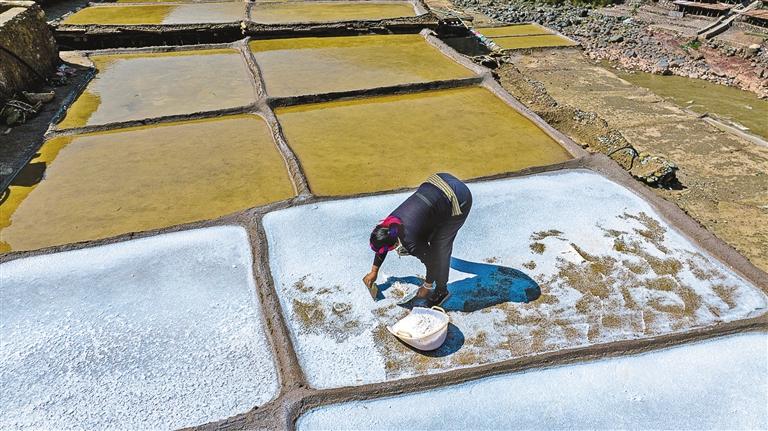 鹽田里,60歲的乃柯正和丈夫一起用木拍夯實鹽田?!艾F(xiàn)在用泵抽水輕松多了,但拍鹽田的手藝不能丟。”老人的話語中,既有對科技的接納,也有對傳統(tǒng)的堅守。鹽田下方,鹽晶垂落成簾,在山風拂動下閃爍微光,仿佛在訴說著什么。一塊塊鹽田如同一面面鏡子,既映照出千年文明的厚重,也折射著鄉(xiāng)村振興的希望。當鹽民們輕掃鹽田,他們掃的不僅是晶瑩的鹽,更是一份在傳承與創(chuàng)新中守護的鄉(xiāng)愁。