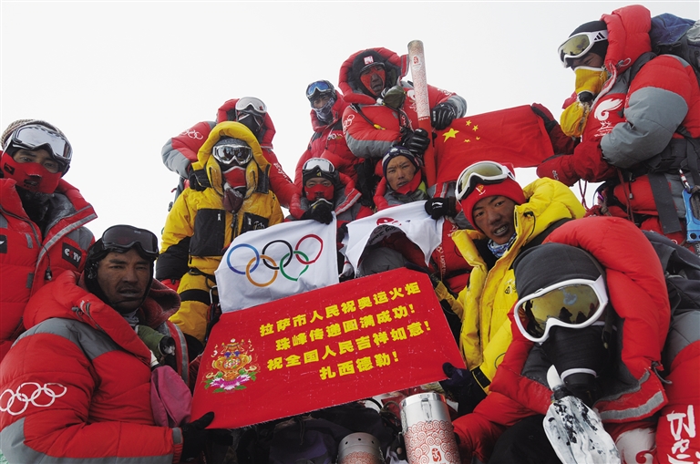 2008年,北京奧運火炬在珠峰峰頂傳遞。自治區(qū)體育局供圖。