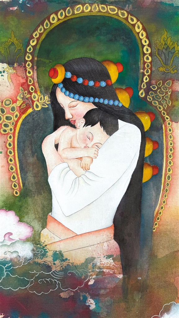 索朗白姆油畫作品《母與子》。