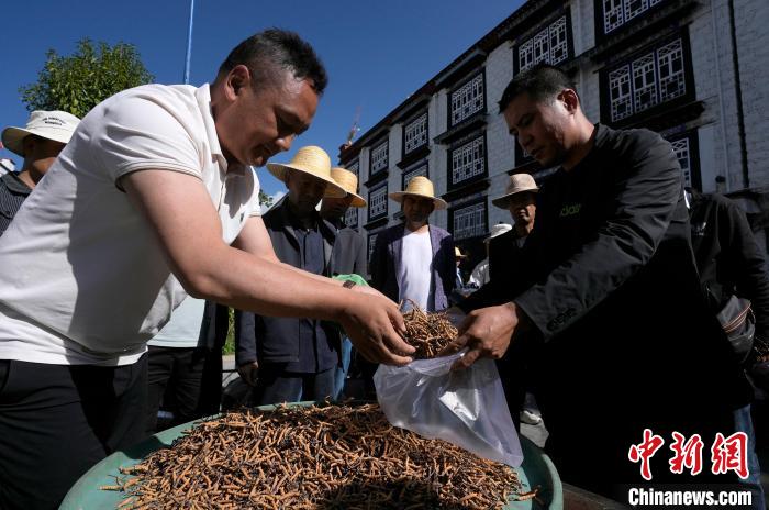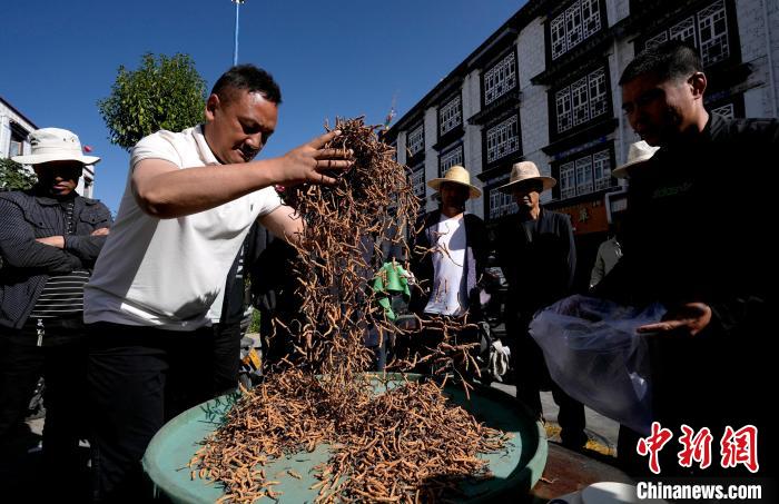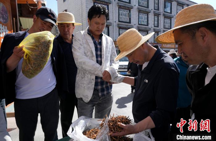 圖為6月13日,蟲草商通過揣袖議價的方式購買冬蟲夏草。中新社記者 李林 攝