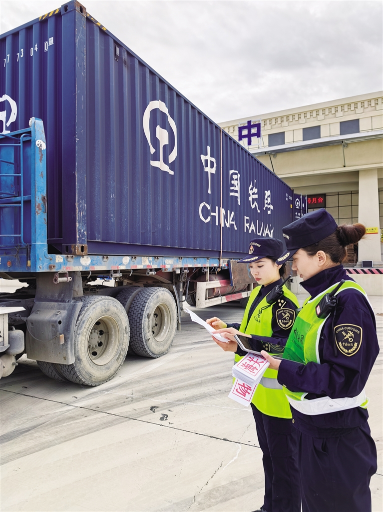 拉薩海關(guān)所屬日喀則海關(guān)在國際陸地港現(xiàn)場監(jiān)管南亞班列轉(zhuǎn)關(guān)貨物。圖由拉薩海關(guān)提供