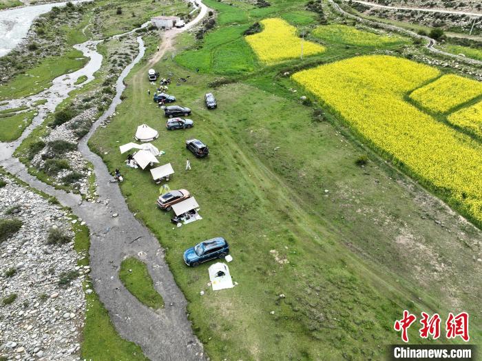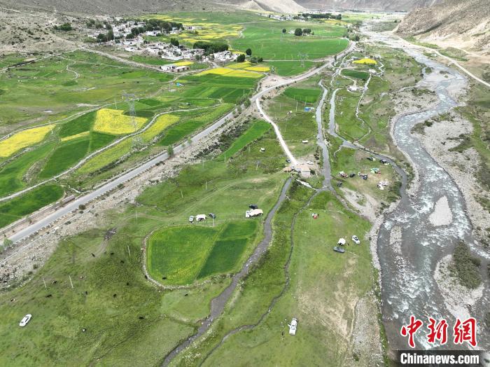 圖為市民在楚布溝里“過林卡”。(無人機(jī)照片)中新社記者 貢嘎來松 攝