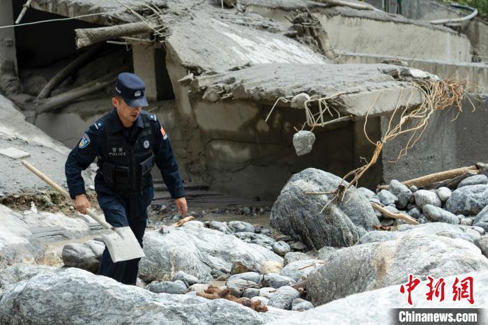 圖為9日,西藏移民管理警察山洪現(xiàn)場排查。肖富貴 攝