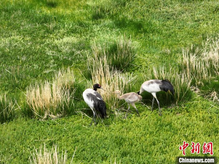 7月10日,在海拔4700米的西藏自治區(qū)那曲市申扎縣濕地里,黑頸鶴一家在悠閑覓食。黑頸鶴是中國國家一級重點保護野生動物,屬高原特有鶴類,主要棲息于海拔2500米至5000米的高原沼澤地、湖泊及河灘等濕地環(huán)境。每年四月起,成對的黑頸鶴陸續(xù)飛抵西藏自治區(qū)那曲市申扎縣,在此繁育后代。近年來,申扎縣持續(xù)加強生態(tài)修復(fù),濕地面積擴大、水質(zhì)改善,為黑頸鶴等珍稀物種提供了理想家園。中新社發(fā) 毛建軍 攝