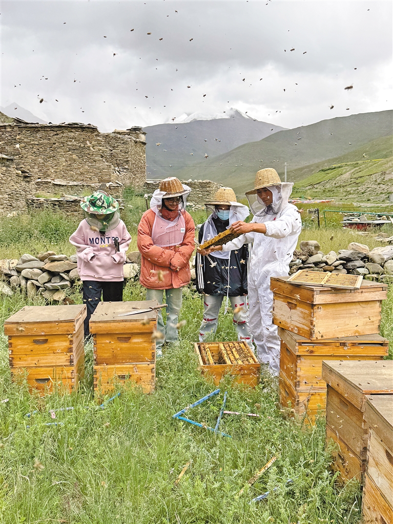 “蜂”產(chǎn)業(yè)激活鄉(xiāng)村振興“甜蜜動能”。走進卡珠村的德康瓦蜜蜂養(yǎng)殖專業(yè)合作社養(yǎng)殖基地,一排排蜂箱整齊擺放,成群的蜜蜂穿梭在花叢間,振翅的嗡嗡聲交織成一曲熱鬧的豐收曲。負責人尼瑪桑旦,一位返鄉(xiāng)創(chuàng)業(yè)的95后大學(xué)生,正帶領(lǐng)員工們忙碌著:“我們創(chuàng)立了‘阿媽準’藏蜜品牌,也在銷售風(fēng)干牛肉、人參果、蕁麻草等特色產(chǎn)品,通過電商平臺,我們的‘哲古味’已經(jīng)賣到了全國。去年銷售額突破了115萬元,還帶動了周邊10多戶群眾增收致富。”這間小小的加工坊,正是哲古鎮(zhèn)推動傳統(tǒng)產(chǎn)業(yè)與現(xiàn)代市場接軌的生動縮影。