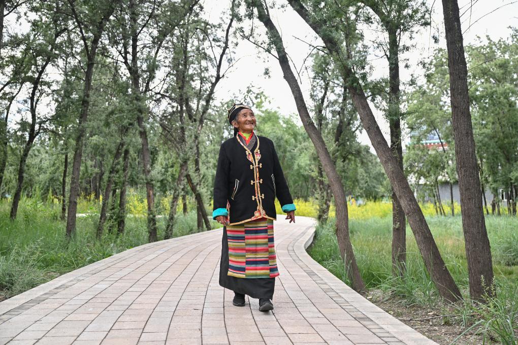 桑旦在隆子縣沙棘林生態(tài)公園內散步。新華社記者 李鑫 攝