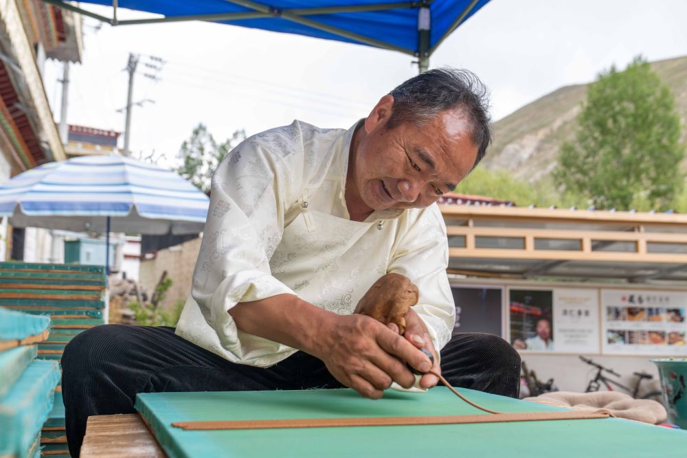 這是一名傳承西藏傳統(tǒng)雕刻修復(fù)技藝的雕刻師(8月6日攝)。西藏傳統(tǒng)雕刻修復(fù)技藝入選西藏自治區(qū)級非物質(zhì)文化遺產(chǎn)代表性項目名錄。
