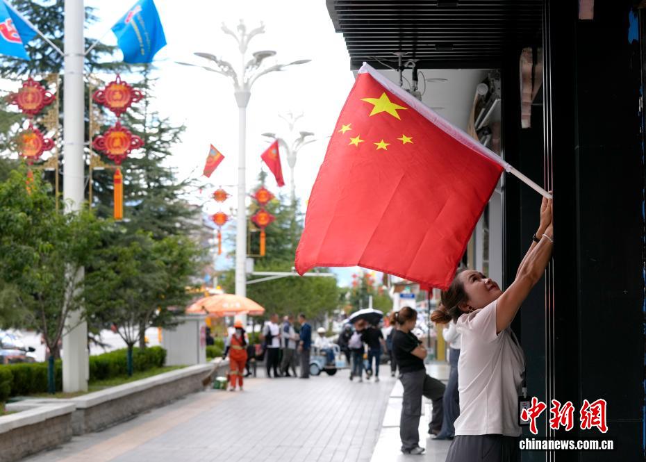 8月19日,隨著西藏自治區(qū)成立60周年慶?;顒优R近,拉薩氛圍濃。拉薩街頭,處處是張燈結彩的盛景,洋溢著一派祥和與歡騰的氛圍。圖為拉薩北京中路商鋪懸掛國旗。中新社記者 李林 攝