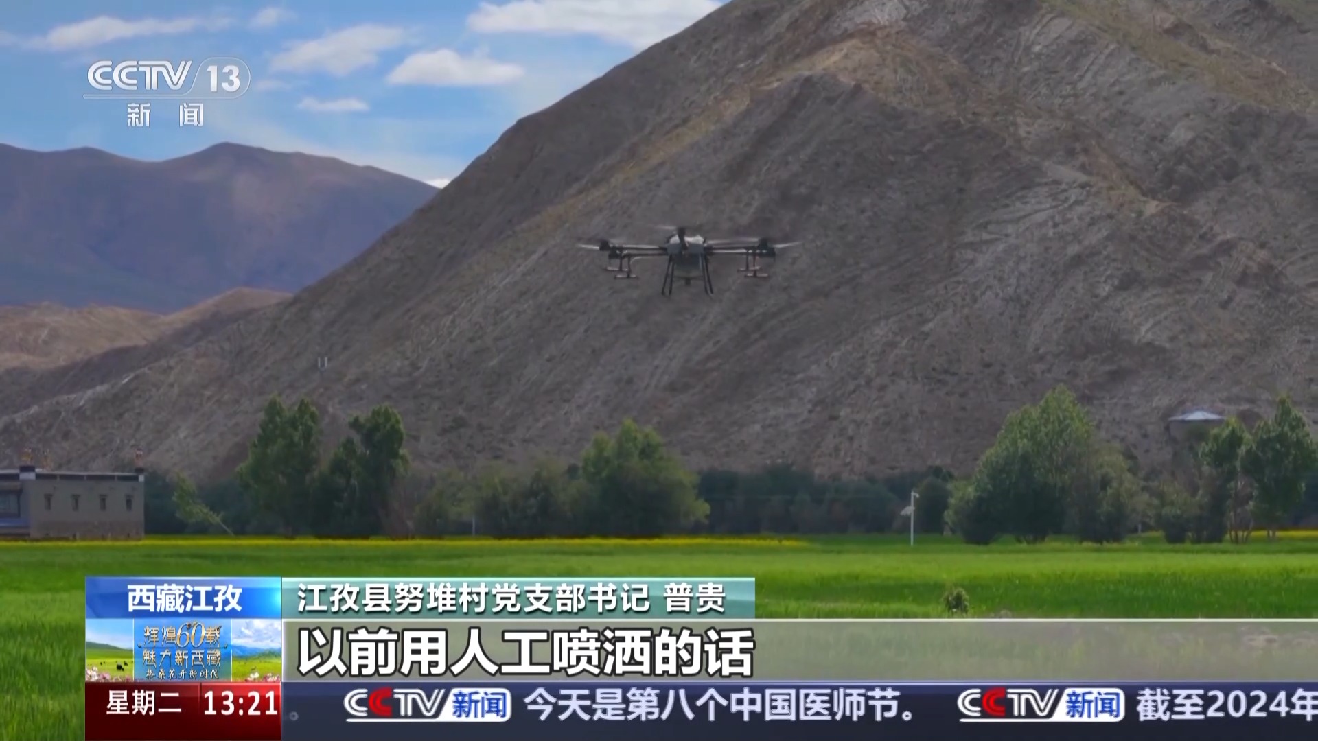 西藏日喀則市江孜縣努堆村黨支部書(shū)記 普貴:這幾天我們正在給青稞噴灑葉面肥,以前人工噴灑,一畝地需要半小時(shí)左右?,F(xiàn)在用無(wú)人機(jī),半小時(shí)能?chē)姙?0多畝地,我們村的2500多畝地大概需要兩天就能完成。