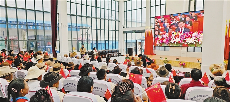 海拔5373米的浪卡子縣普瑪江塘鄉(xiāng)干部群眾通過多種形式收聽收看大會盛況,共同見證這一重要的歷史時刻。普瑪江塘鄉(xiāng)黨委書記多吉旺久說:“60年來,普瑪江塘鄉(xiāng)從過去靠天吃飯到如今靠科技吃飯,巨大的變化離不開黨中央的親切關懷和黨的民族政策,我們一定銘記黨的恩情,永遠聽黨話、感黨恩、跟黨走?!?/p>