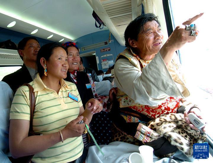 2006年7月1日,烏金(右一)乘坐的“藏2”次列車經過自己家鄉(xiāng)安多時,興奮地指向車外,向同伴介紹。