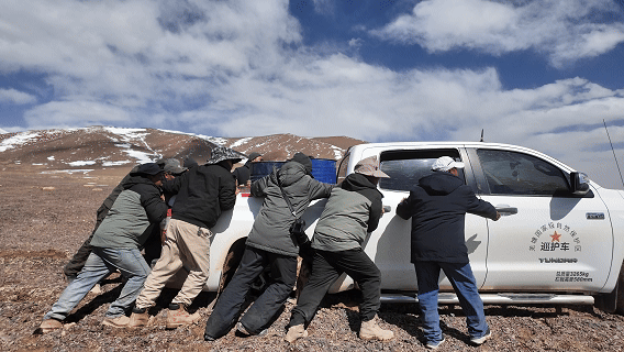 眼前這一幕仿佛預(yù)示著藏羚羊的遷徙之路和我們的巡護之路同樣艱難。再往前行駛不遠,車隊中的皮卡車肉眼可見在泥里越陷越深。