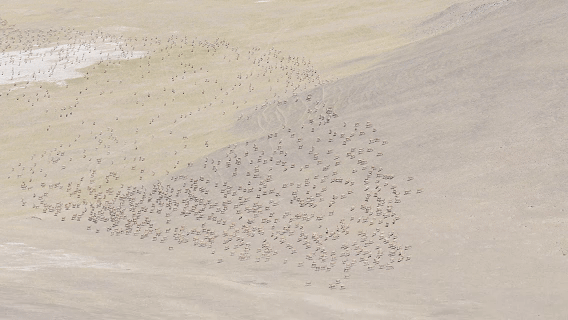 在這段來時無比顛簸的路上,我們?nèi)缏钠降?。時間好像凍結(jié)了,直到我們登上那個山坡,數(shù)不盡的藏羚羊挑破了凝固的空氣,成千上萬的脊背在山坡上流動,山脊上藏羚羊的剪影印刻在天際線上。