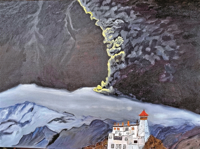 推開羽芊位于拉薩東郊的家門,目光首先被三面通體書墻溫柔捕獲。文學(xué)、歷史、自然、科學(xué),上萬冊藏書如沉默的智者靜立。書柜一角,整齊擺放著《藏婚》《西藏生死戀》《金城公主》等十五部藏地題材作品,每一本都浸潤著高原陽光的暖意。四處打量,書桌旁立著一個畫架,未完成的油畫上,藏北草原斑斕秋色正流淌在畫布上,透露出她對光影與色彩天生的敏銳——這份未被刻意強(qiáng)調(diào)的油畫天賦,悄然浸染著她的文學(xué)世界。