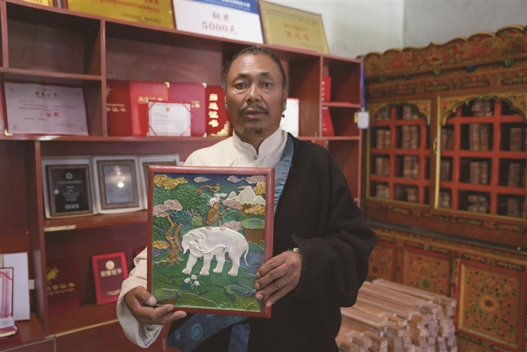 為了進(jìn)一步傳承和發(fā)展普松雕刻技藝,同時(shí)帶動(dòng)鄉(xiāng)親們?cè)鍪罩赂唬?019年,斯曲成立了尼木縣珍寶民族雕刻手工藝農(nóng)牧民專(zhuān)業(yè)合作社。合作社成立之初,只有8名徒弟追隨他,而如今,這支隊(duì)伍已經(jīng)壯大到了12人,并帶動(dòng)村里50余人實(shí)現(xiàn)就近就業(yè),為當(dāng)?shù)氐慕?jīng)濟(jì)發(fā)展注入了新的活力。同時(shí),隨著政府對(duì)傳統(tǒng)手藝的重視程度不斷提高,以及旅游業(yè)的蓬勃發(fā)展,來(lái)當(dāng)?shù)氐挠慰腿找嬖龆?。這不僅讓普松雕刻這門(mén)技藝被更多人所知曉,也極大地拓寬了合作社的銷(xiāo)售渠道。