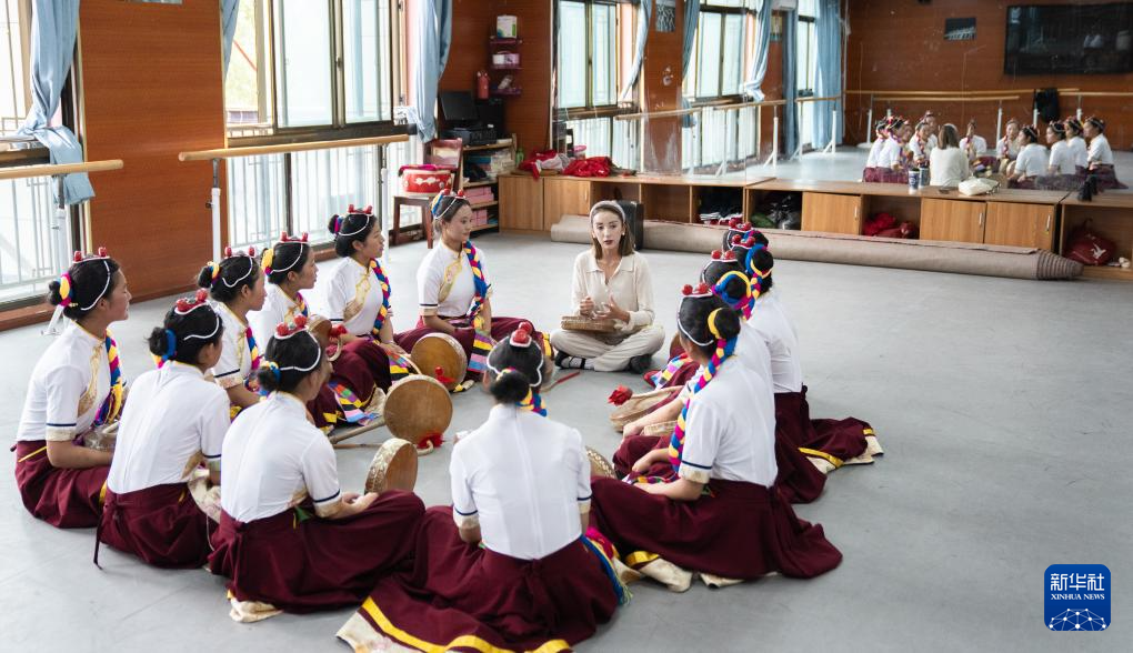 9月9日,在拉薩市第二中等職業(yè)技術(shù)學(xué)校,孩子們在熱巴舞練習(xí)間隙聽尼瑪卓瑪老師(左二)講熱巴舞的發(fā)展歷程。新華社記者 張笑宇 攝