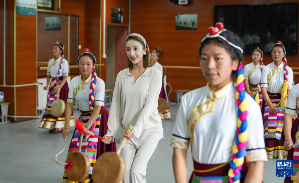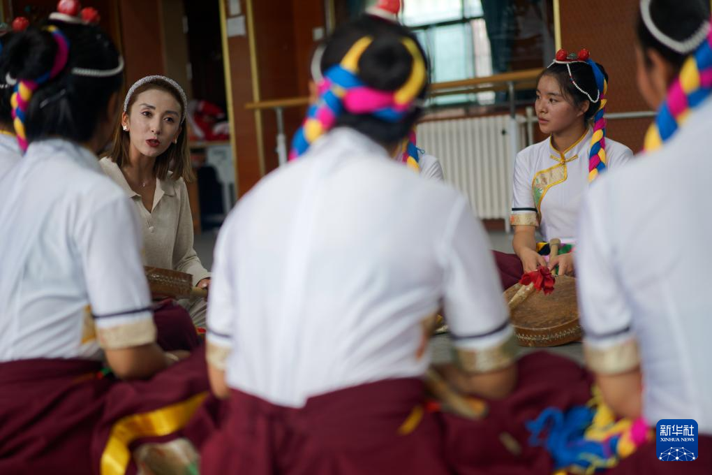 9月9日,在拉薩市第二中等職業(yè)技術(shù)學(xué)校,尼瑪卓瑪老師(右二)指導(dǎo)孩子們舞蹈動(dòng)作。新華社記者 丁增尼達(dá) 攝