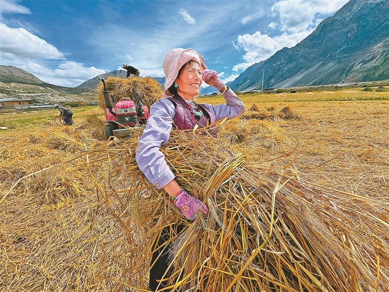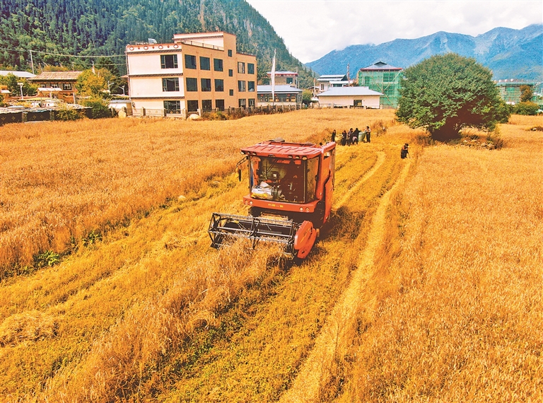 在拉薩市墨竹工卡縣唐加鄉(xiāng)莫沖村,田間地頭繁忙景象撲面而來(lái)。幾臺(tái)大型收割機(jī)轟鳴著在金色的農(nóng)田里來(lái)回穿梭,收割、脫粒一氣呵成,村民們跟在機(jī)器后方,有條不紊地進(jìn)行后續(xù)整理工作,呈現(xiàn)出一派熱火朝天的豐收?qǐng)鼍?。村民貢嘎頓玉向記者介紹,“我家共有37畝農(nóng)田,10畝種小油菜,27畝種青稞。以前全家4口上陣得忙上一個(gè)多月,現(xiàn)在有了機(jī)械化作業(yè),短短幾天就能完成所有秋收工作,既省時(shí)又省力?!?/p>